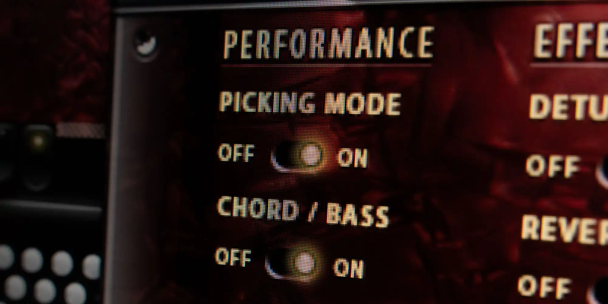 Slight detune adds warmth, strong detune gives the typical French accordion vibrato. Amount is adjustable.