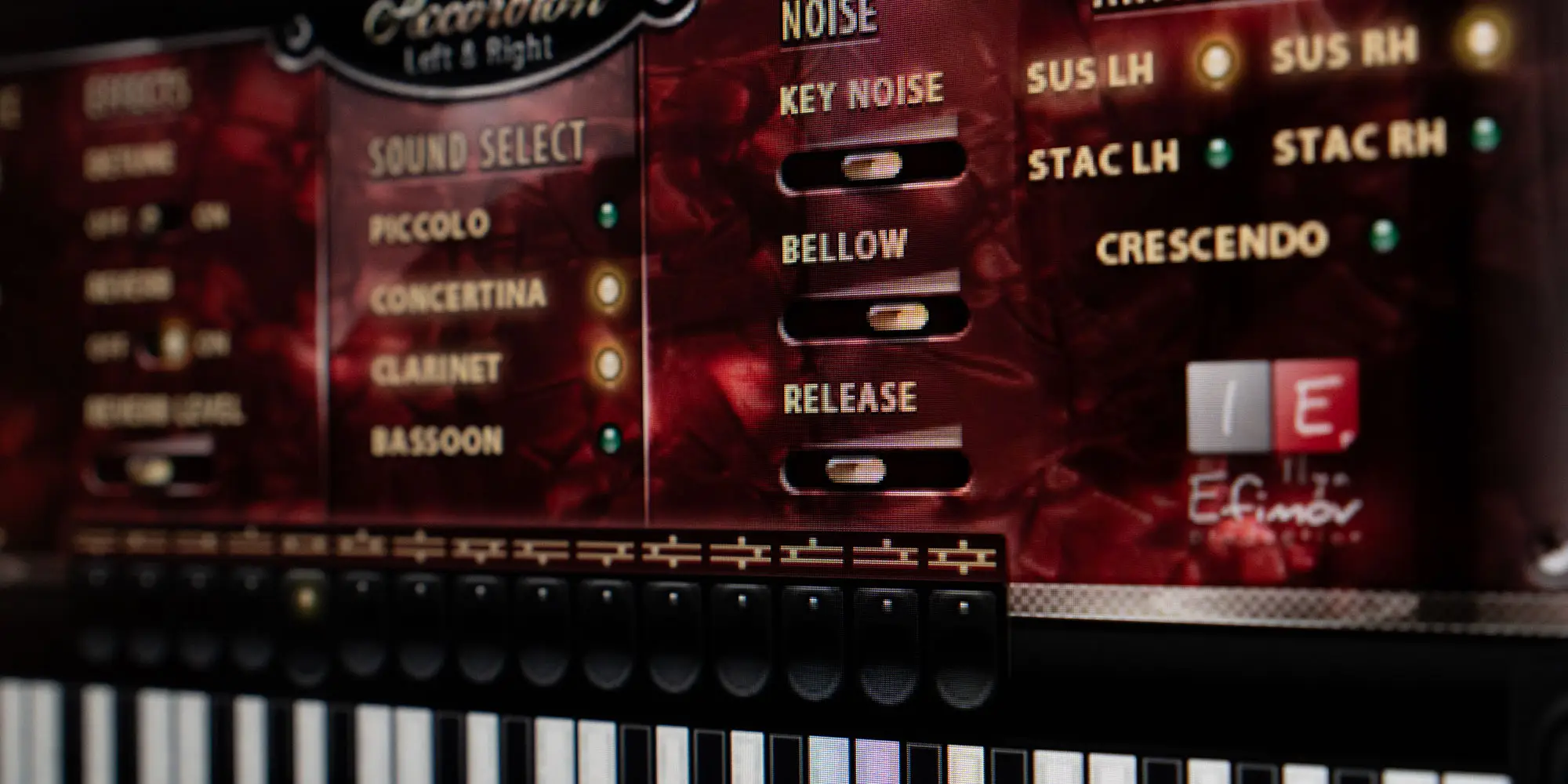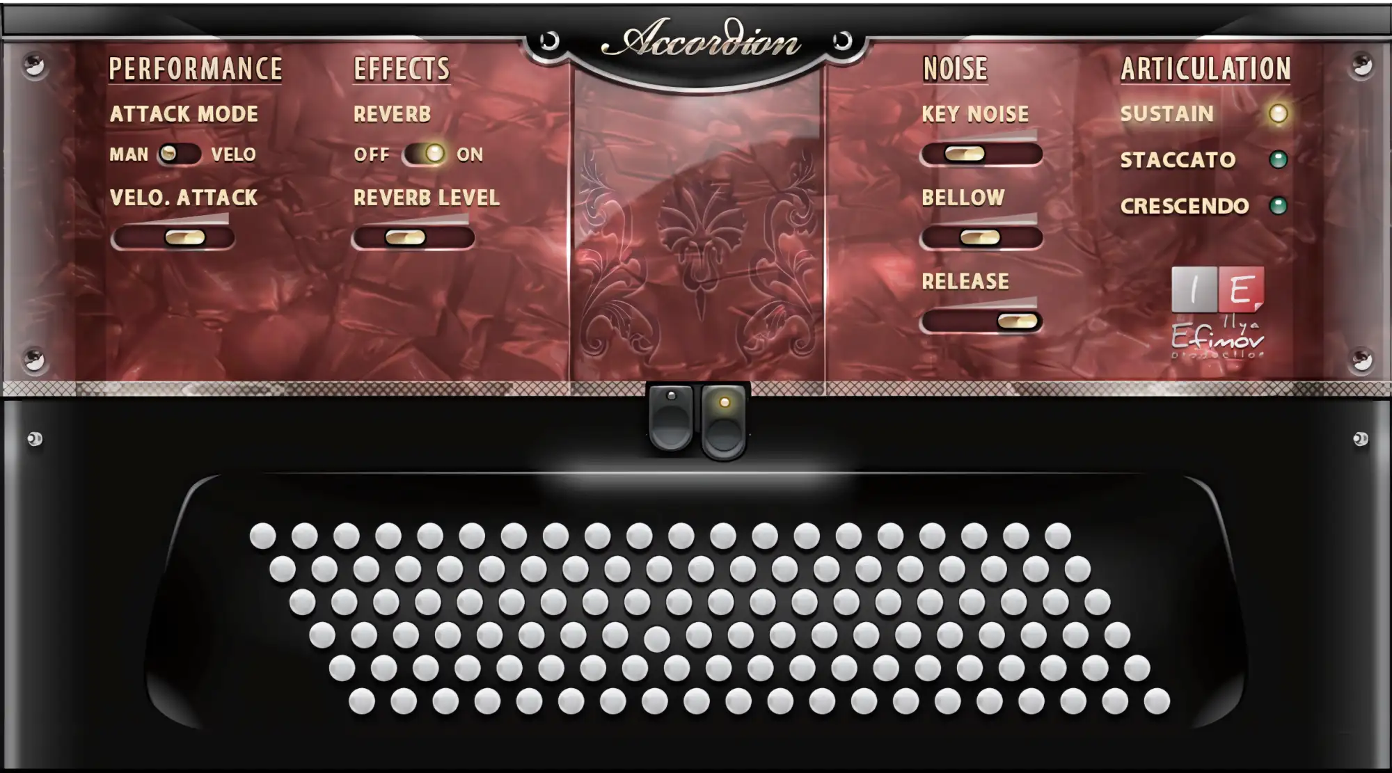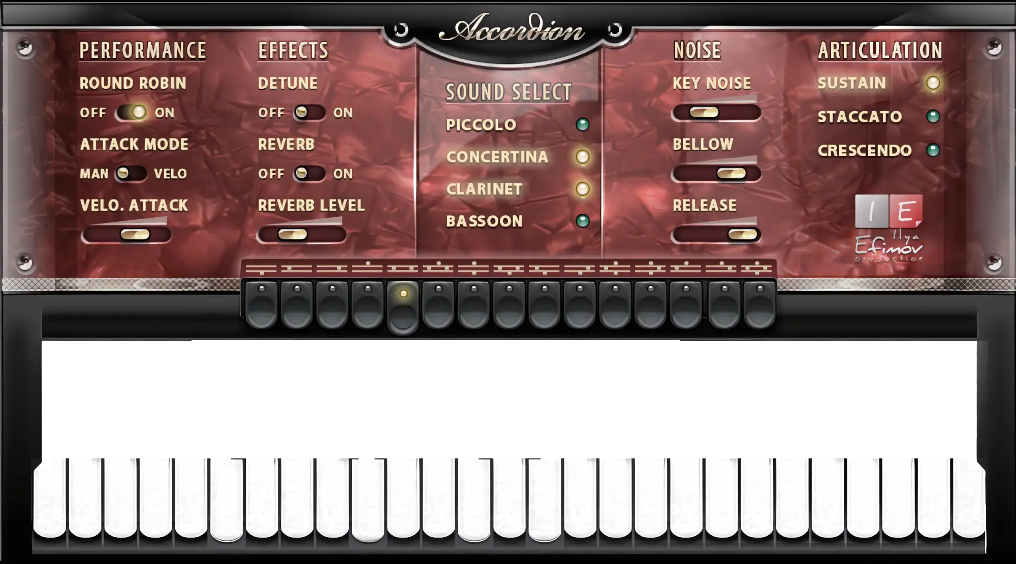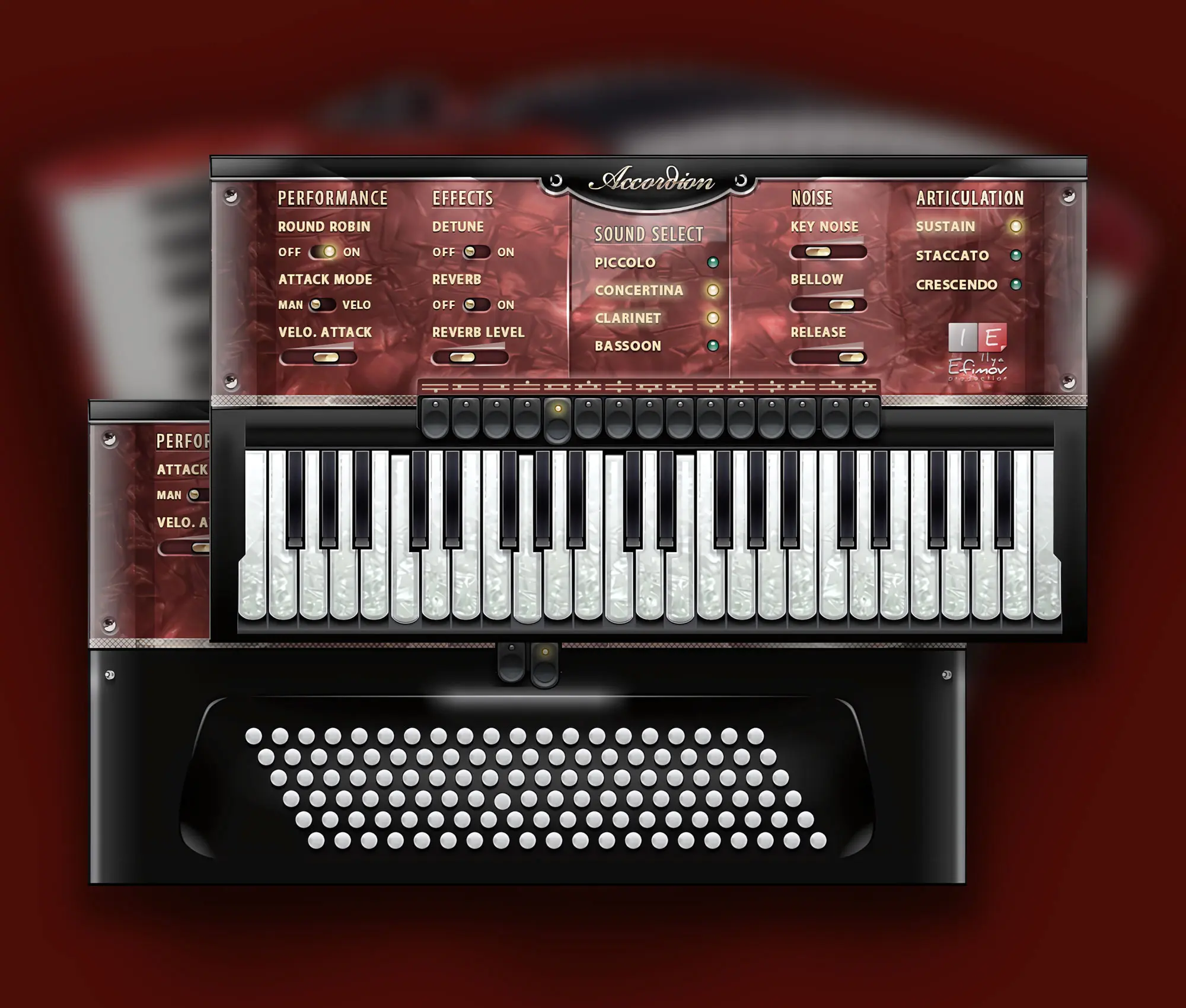 We created the fullest emulation of the famous European instrument, including the selection among 15 combinations of timbral registers, just like with a real accordion.