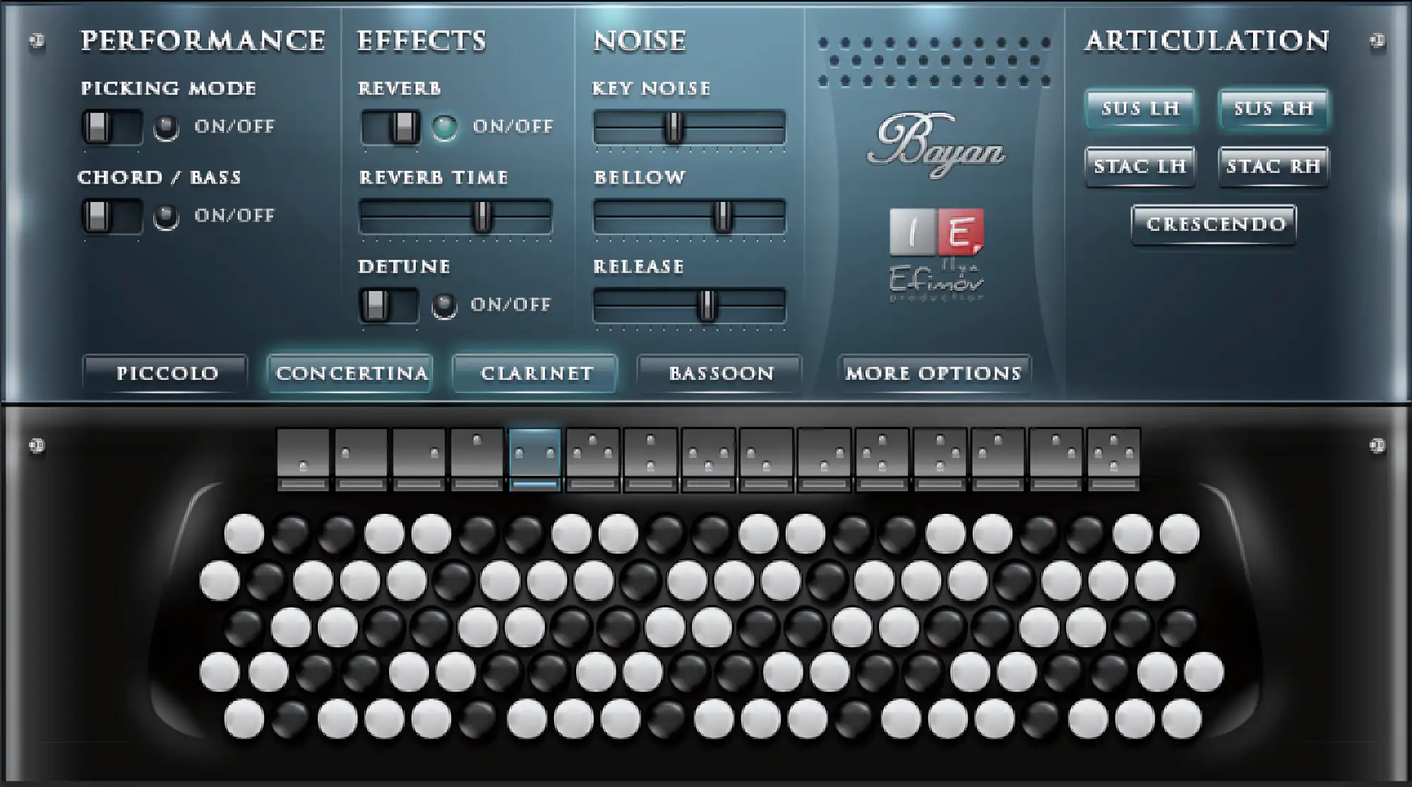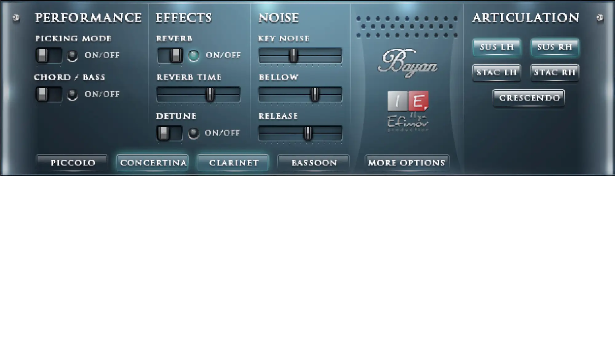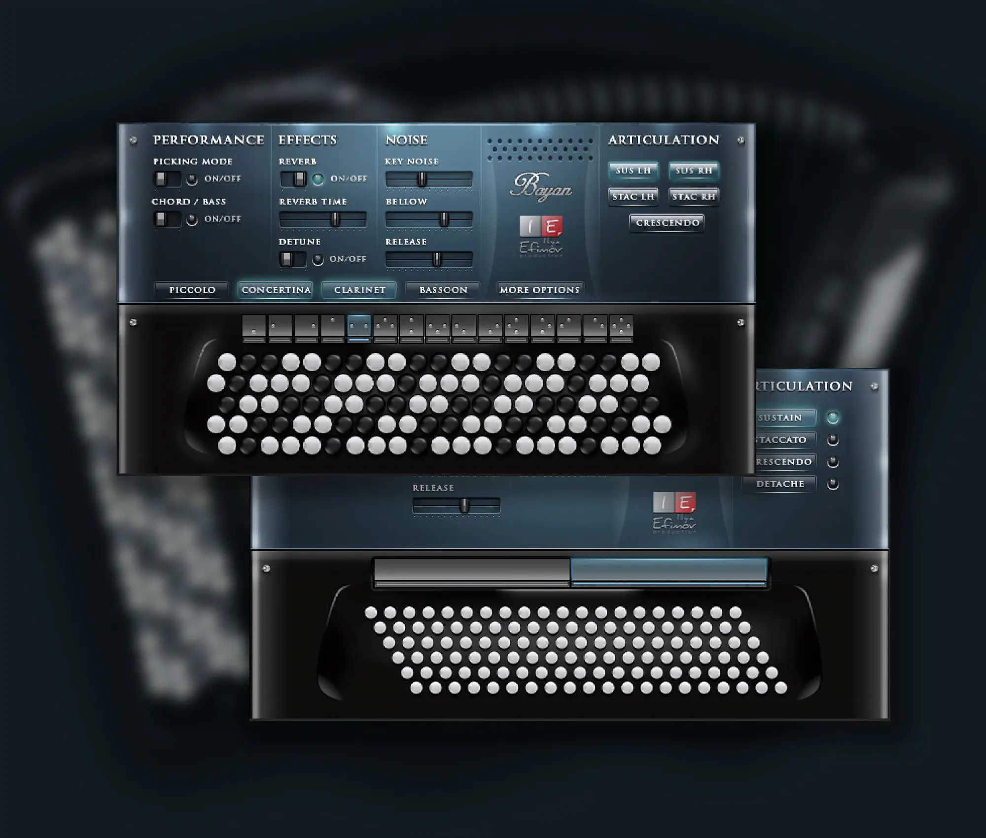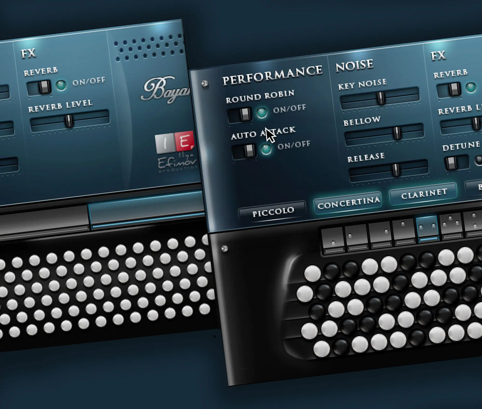 Bayan is one of the most perfect chromatic accordions in existence today. Either performing solo or in an ensemble, our emulation of the instrument will provide your tracks with the full capabilities of its real world prototype, like 15 different combination of voices, chord recognition for easy accompaniment or сrescendo and detache techniques.