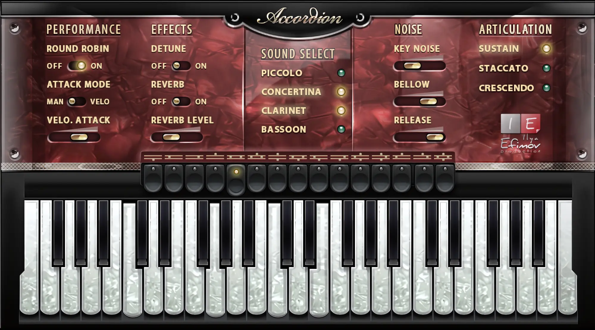 A dedicated function simulates the vibrato and tonal character of traditional musette-style accordions.