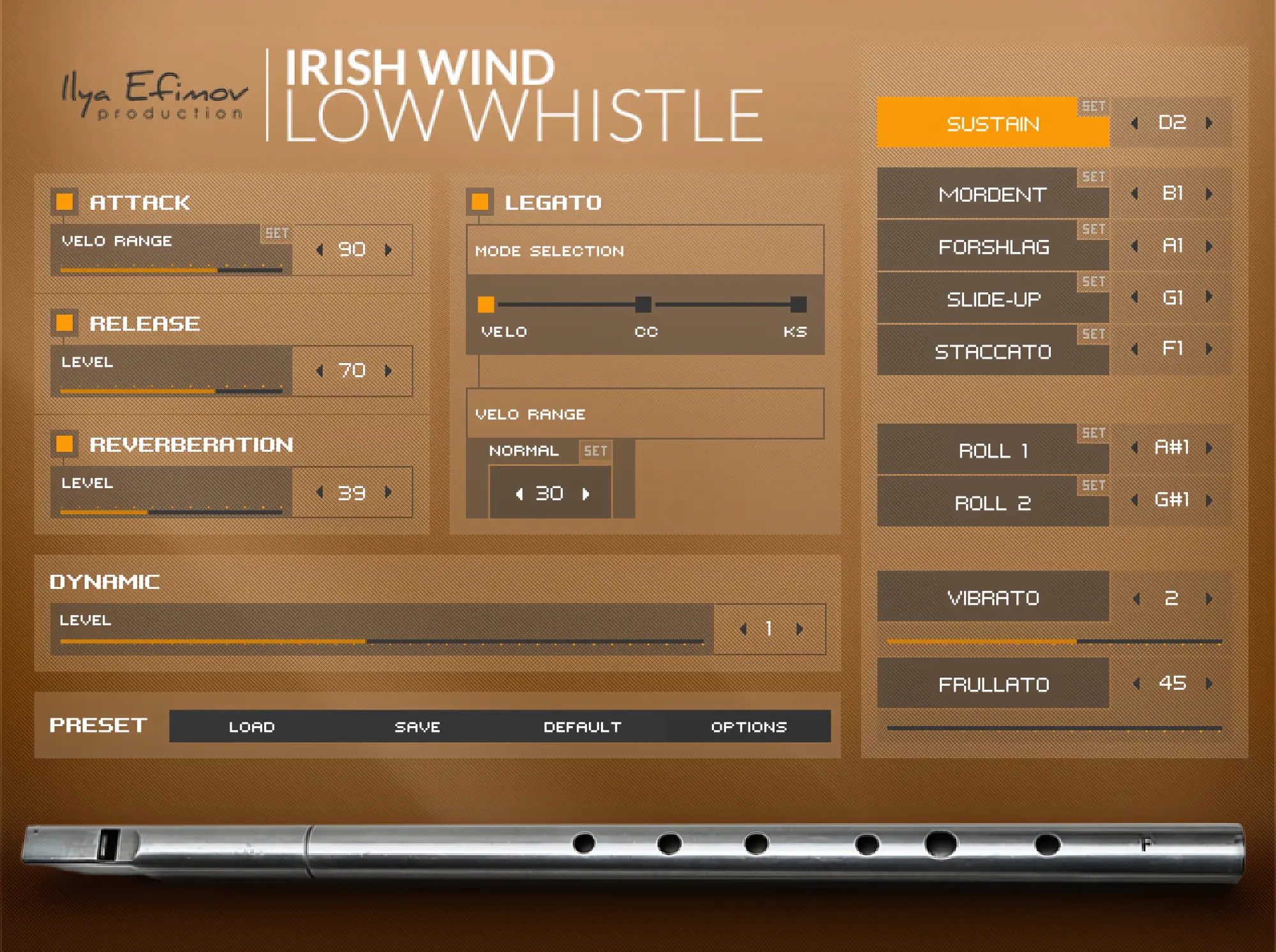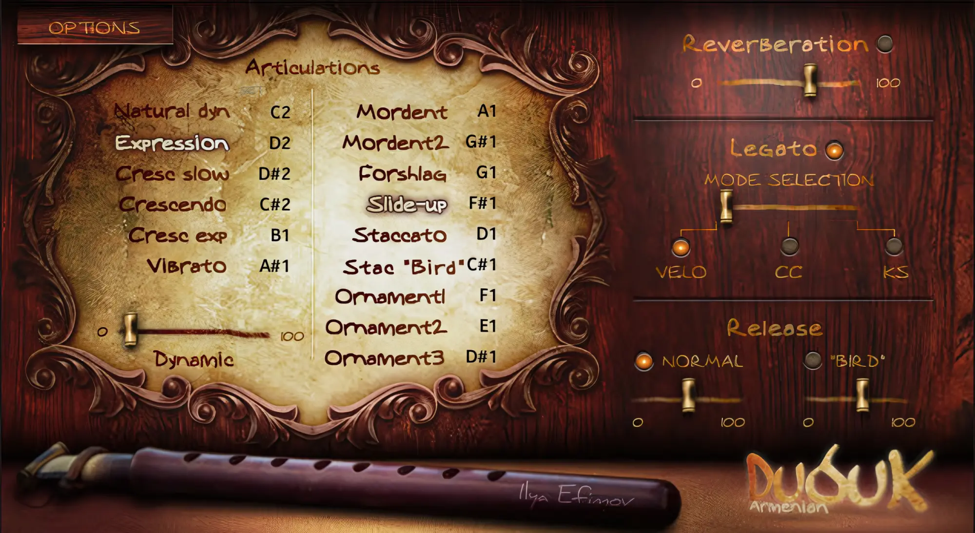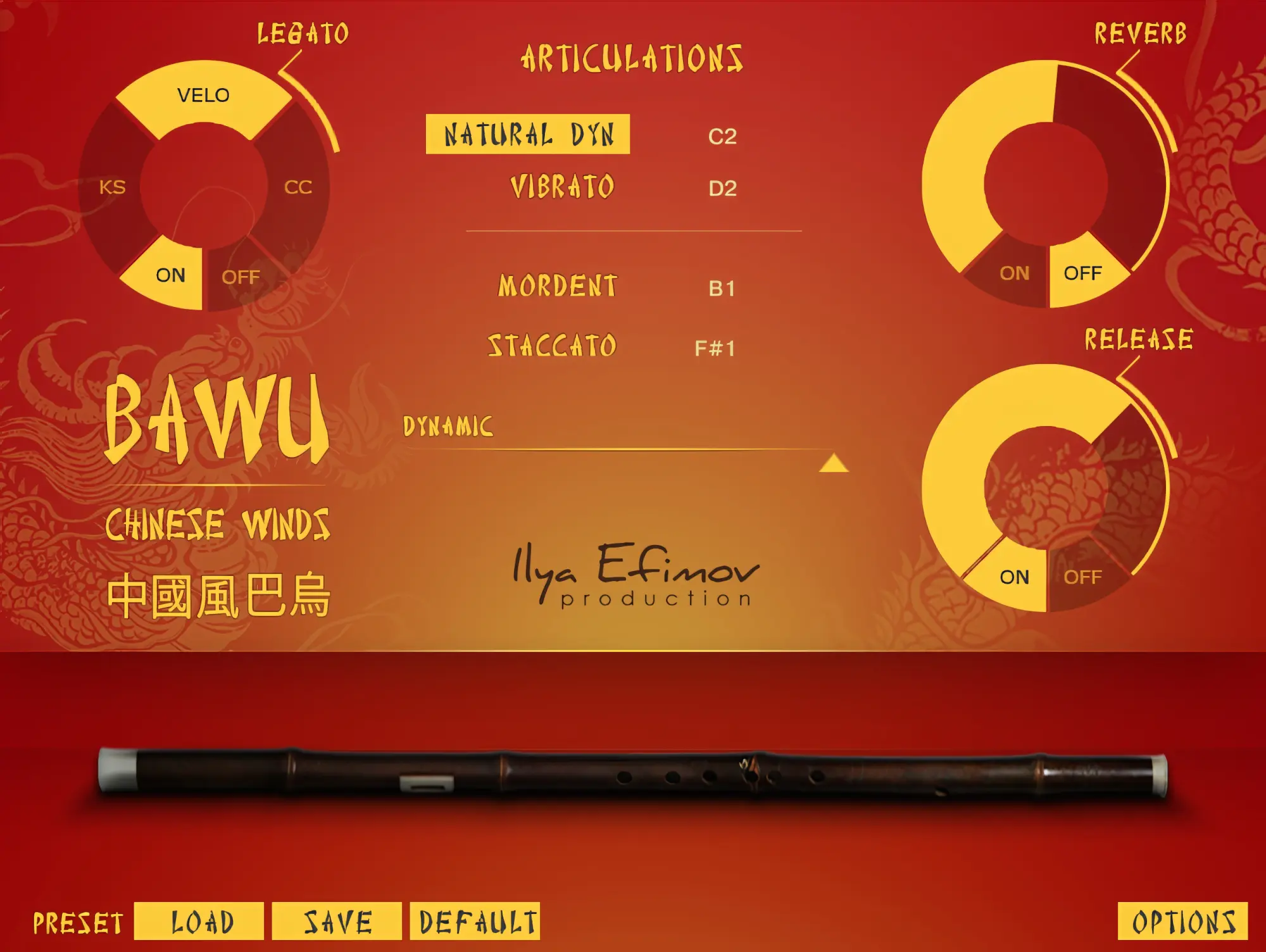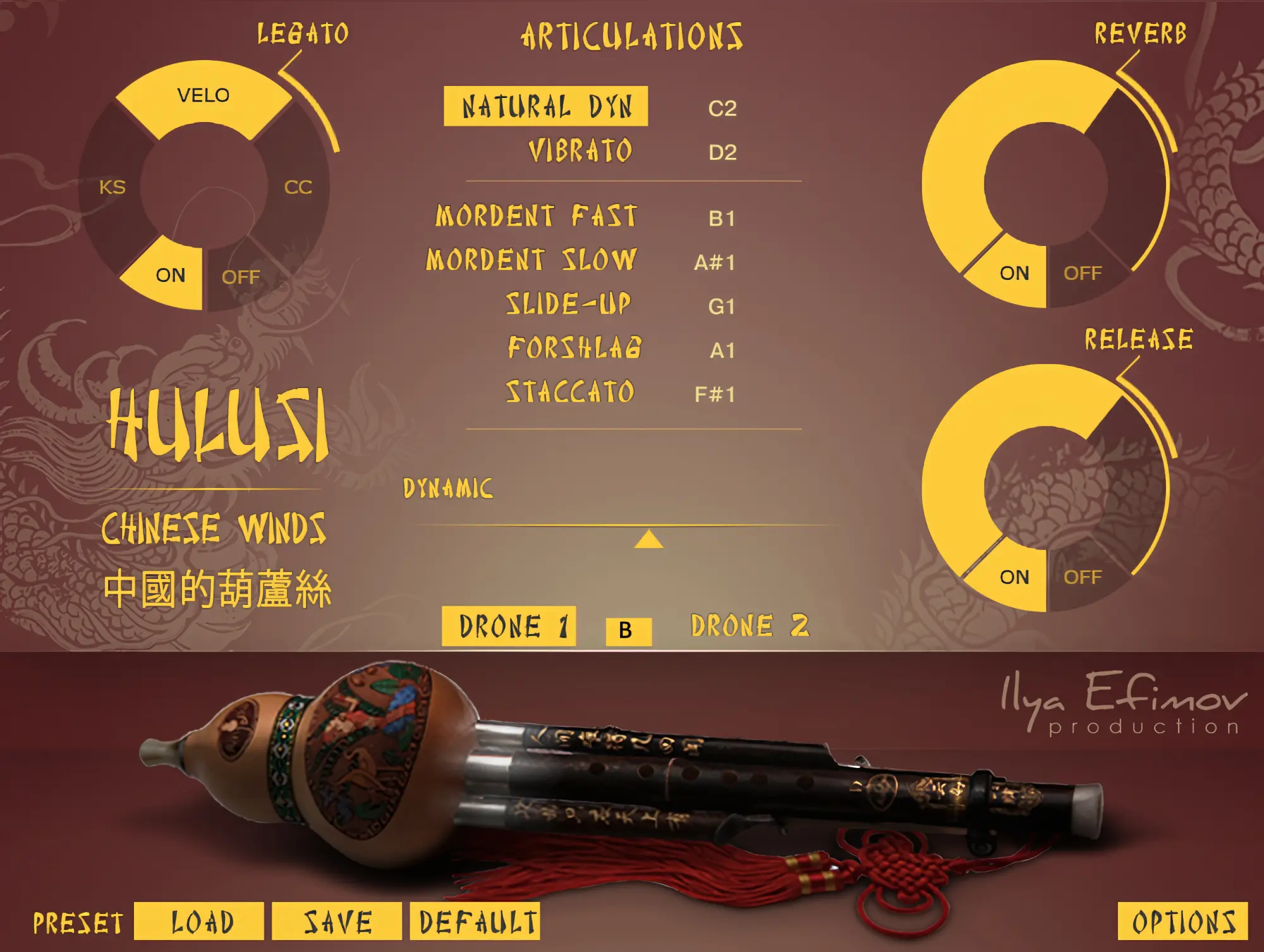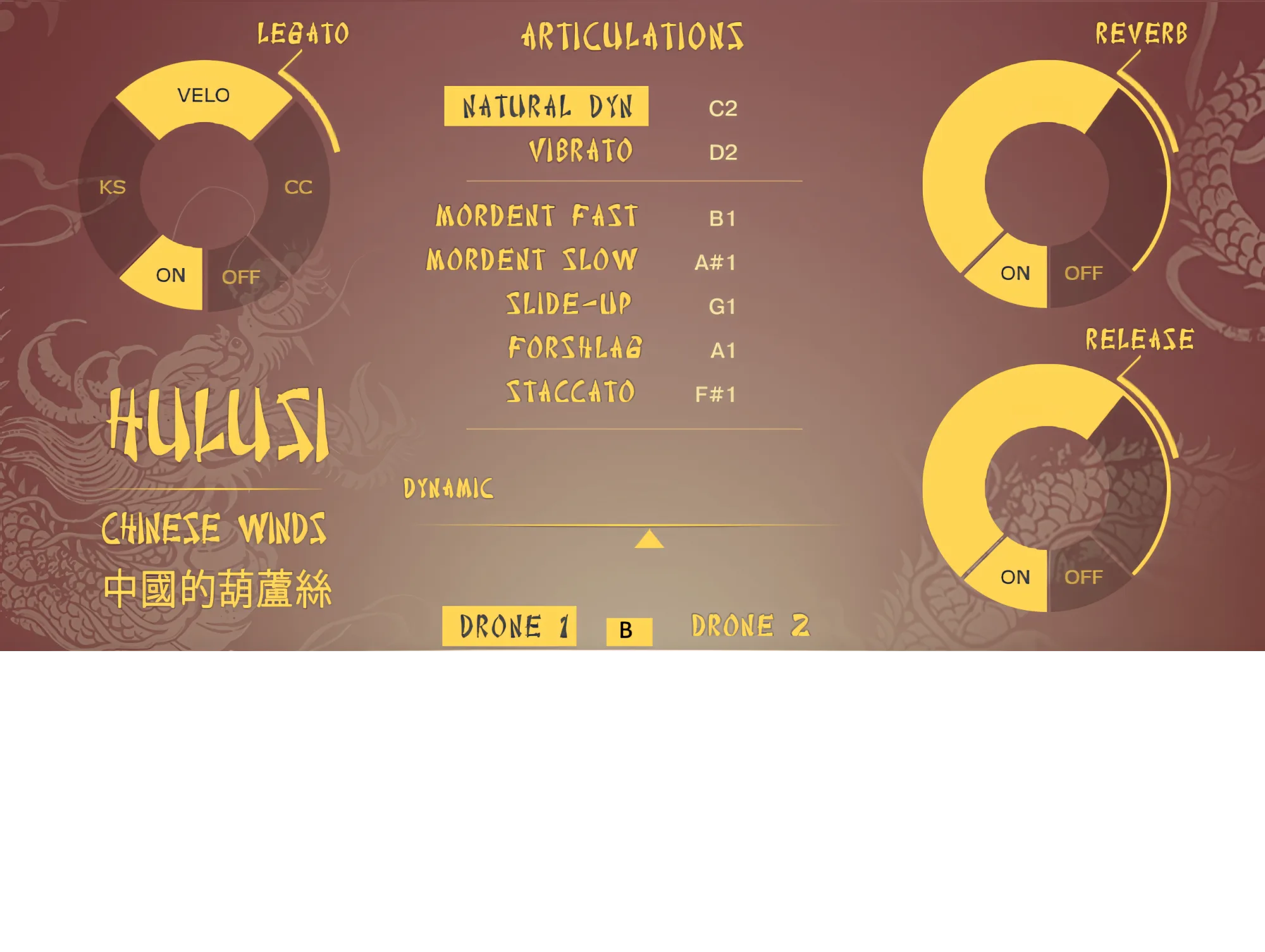 The Hulusi, a free reed wind instrument, creates enchanting melodies with its three bamboo pipes - main chanter and drones. Our library allows imitating virtually anything that a real hulusi can perform. Including slide-ups, grace-notes and natural vibrato.