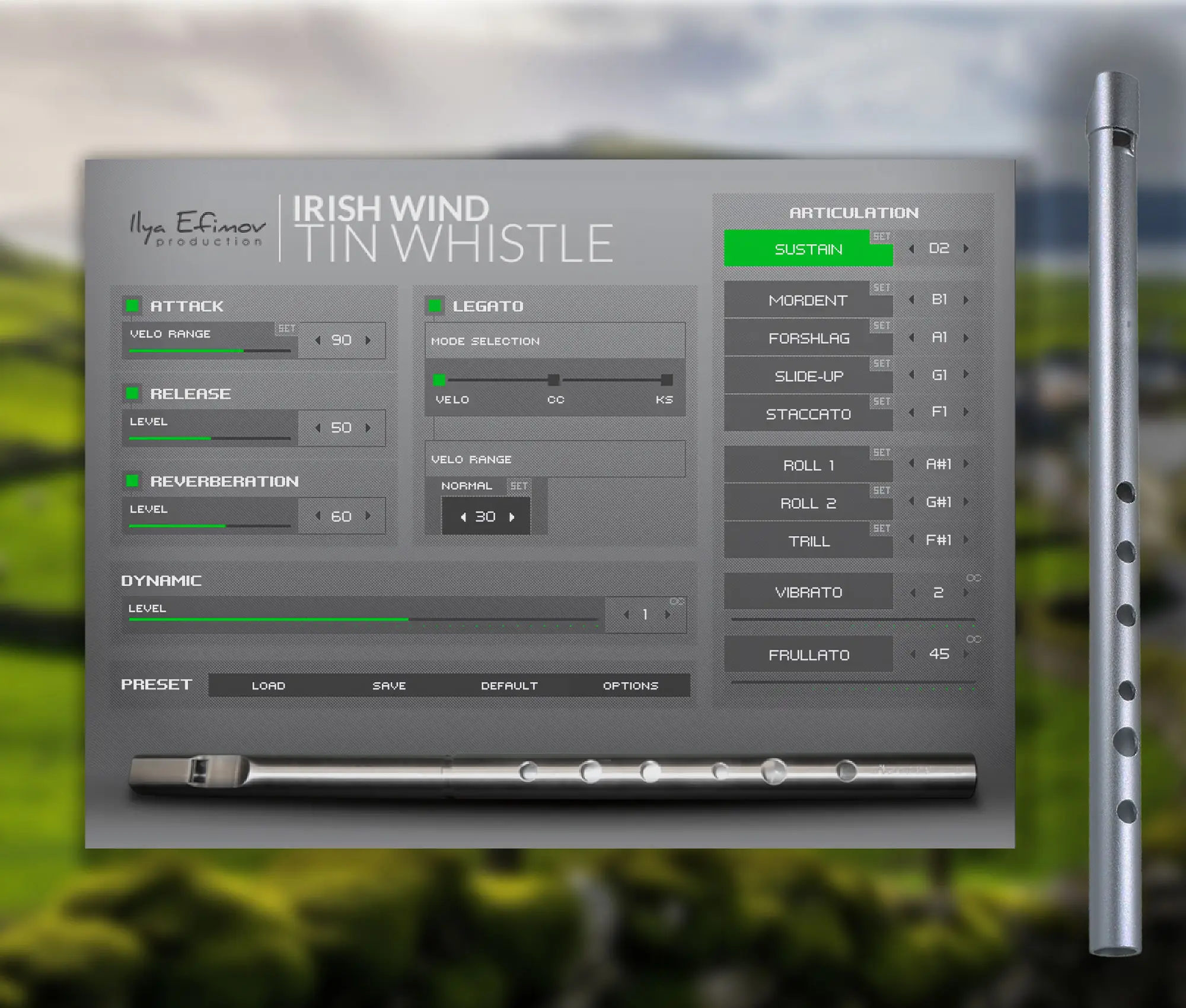 The Tin Whistle is a six-hole flute closely associated with Celtic music. Despite the alleged simplicity of the instrument, we managed to emulate its most interesting techniques, like glissando legato, frullato, vibrato and staccato.