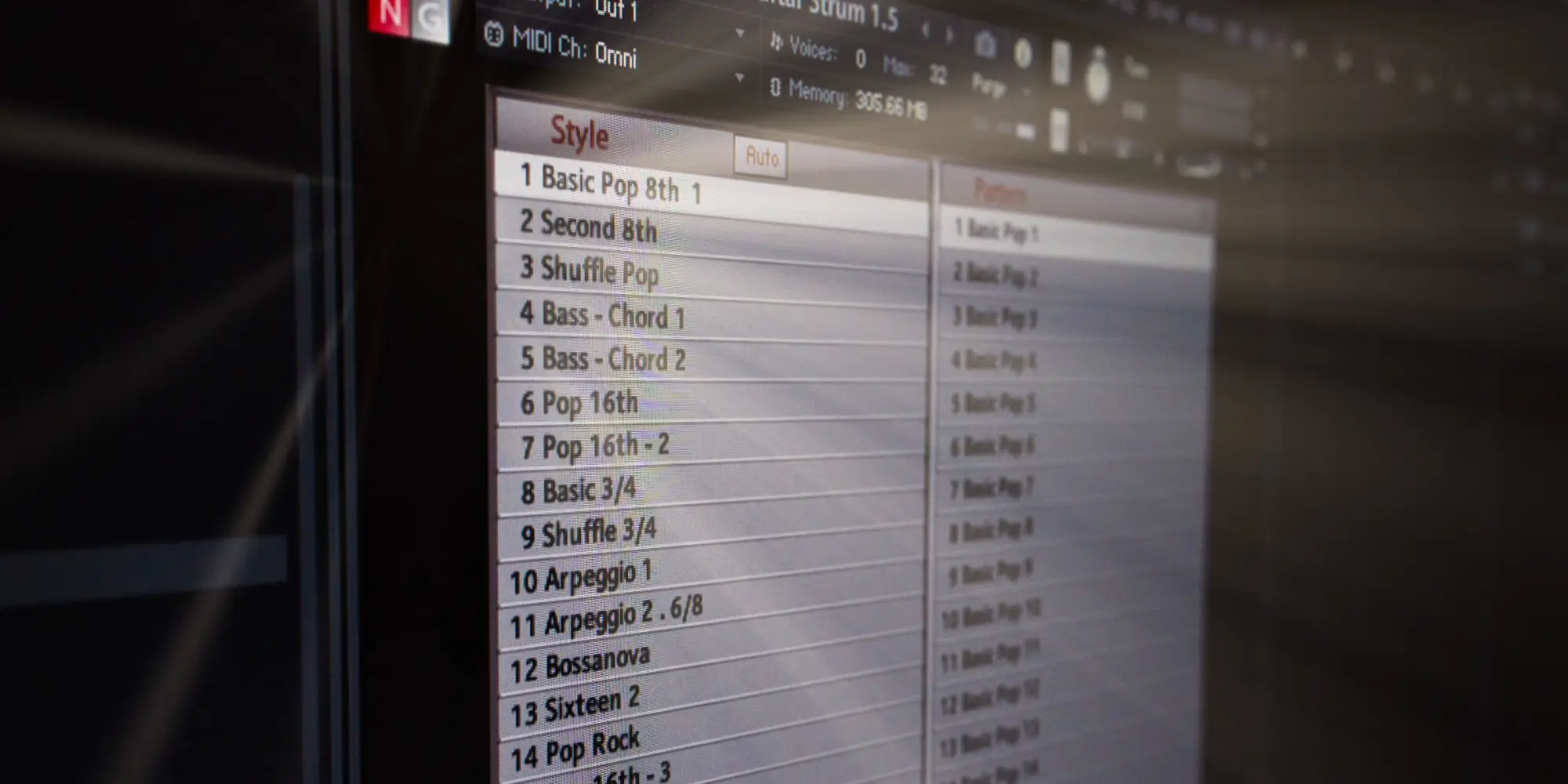 The library includes over 250 ready-to-use rhythm patterns across various styles, from gentle ballads to uptempo Latin grooves. You can load, preview, and switch patterns instantly, or mingle them into a MIDI-track. Thus they can accurately follow bars structures, time signatures and tempo.