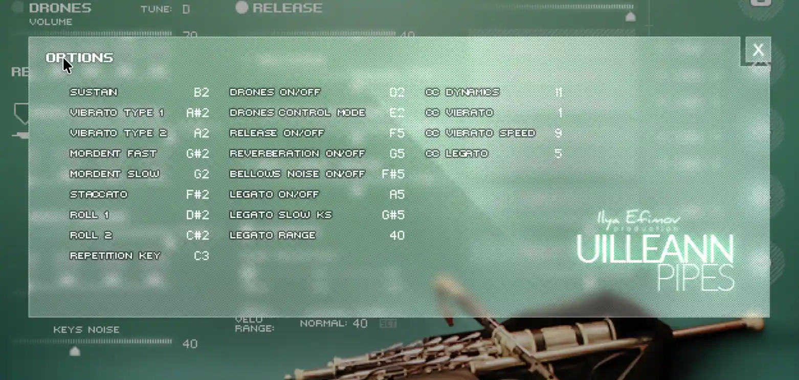 are the national bagpipe instrument of Ireland, which have an unusual and complex construction. With this library - a tricky instrument becomes available and easy to play for anybody! With all main features emulated, like drones and regulator reeds.