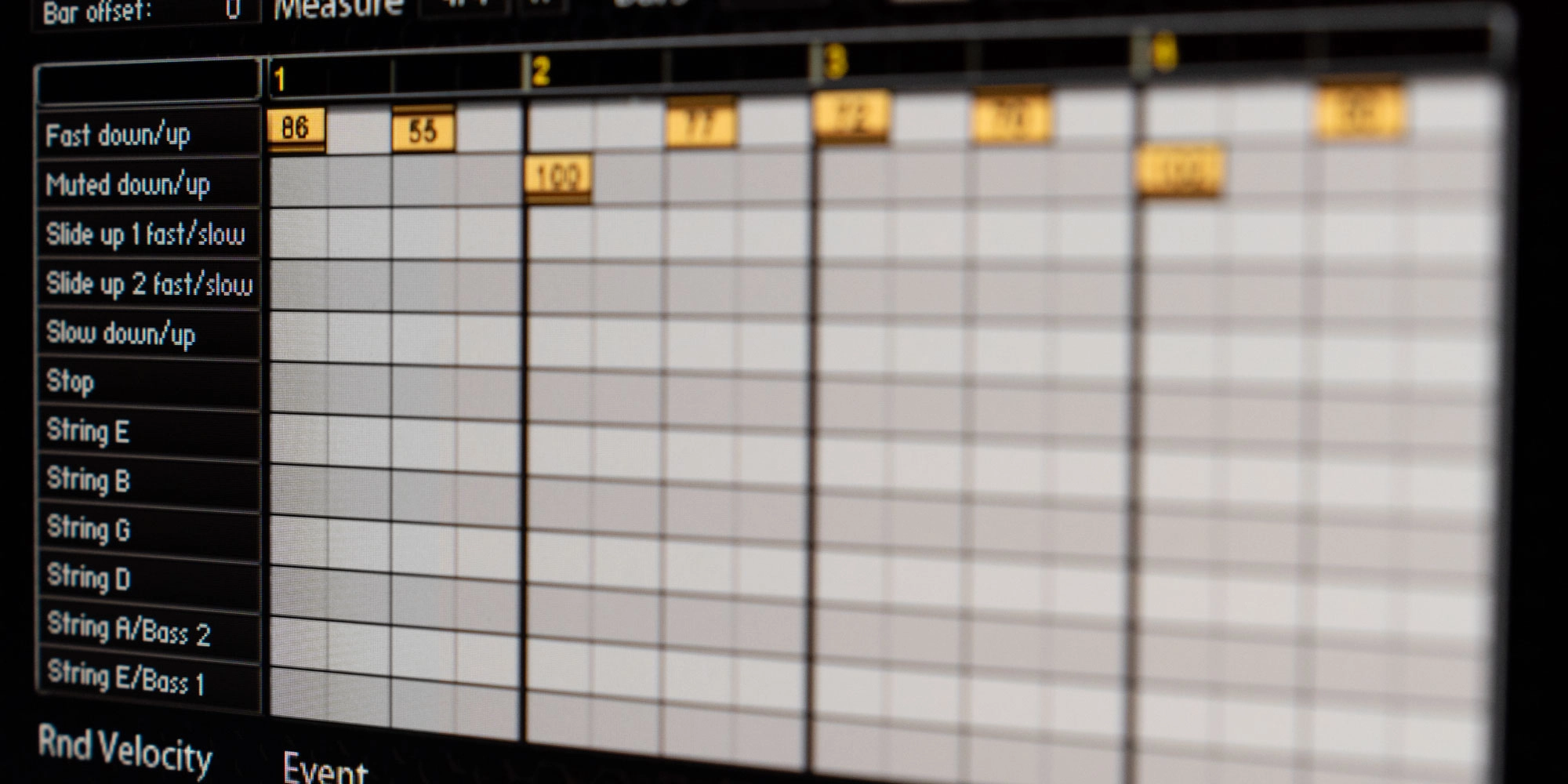 Strum engine includes 250+ pre-made rhythm patterns across 20 playing styles. The visual editor lets you build new patterns using articulations and single string notes in a sequencer-style grid. Each pattern supports up to 4 bars, full quantization, and dynamic control. Patterns can be chained into songs and switched live or automated via keyswitch.